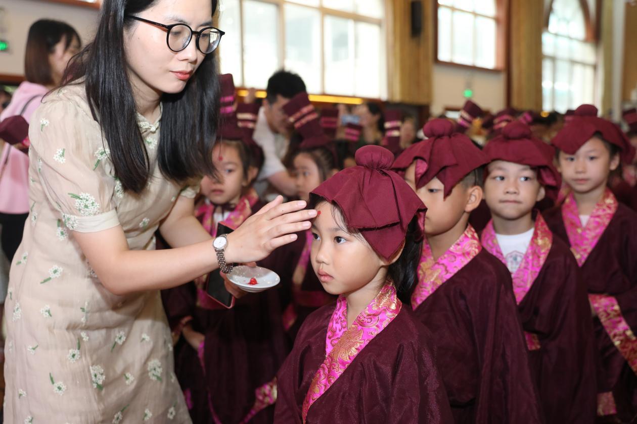 作为杭州市拱宸桥小学实行十余年的传统仪式——新生入泮仪式于8月29日上午在永宁校区崇德堂举行。仪式分为“净手净心”“击鼓明志”“端正衣冠”“参拜孔子”“点砂开智”“开笔启蒙”“入泮宣誓”等流程,新一年级生和他们的家长们体验了入泮全程,感受了传统古礼的文化洗练。