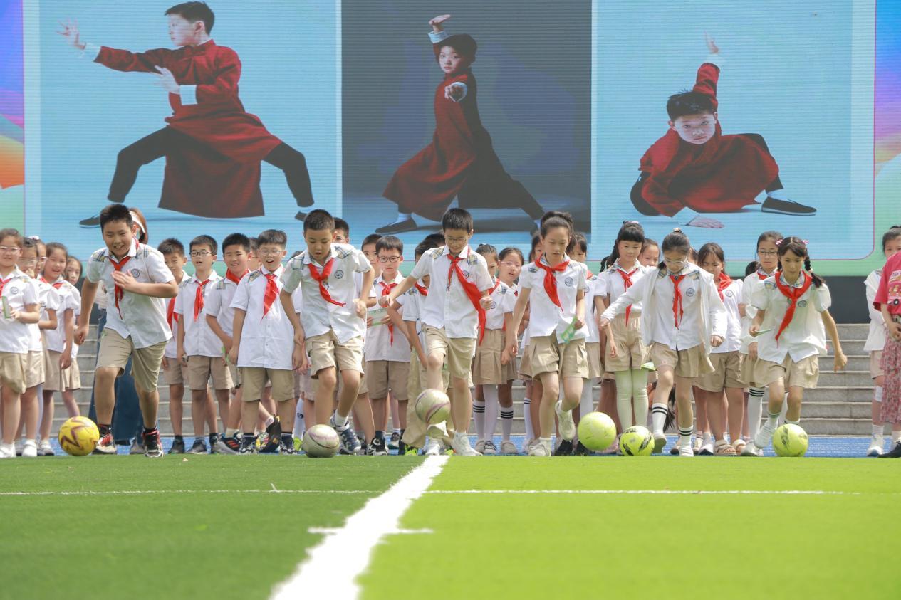 开学典礼上,湖州市爱山小学教育集团全体师生以“趣味迎亚运、驰骋新赛道”开启了开学第一课。“中华武术”“健步走”“趣味运球”,孩子们激情澎湃,在崭新的操场上完成一个个运动打卡,还获得了一张张印有亚运吉祥物的纪念卡,以实际行动迎接亚运会的到来。