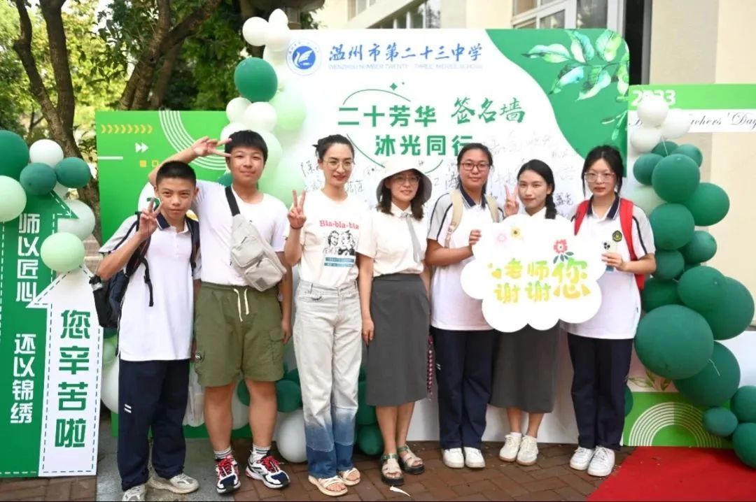 白露至,秋实美,万物恰逢其时。为弘扬教书育人、为人师表、爱岗敬业的良好师德风尚,温州市第二十三中学开展了主题为“二十芳华,沐光同行”的教师节庆祝大会。大会颁发校级优秀教师、校师德考核优秀教师等荣誉,并对年度获市级、区级荣誉的教师进行表彰。“为教育发展、国家繁荣和民族振兴努力奋斗!”最后,二十三中老师们高举右拳,重温誓词。这是教师对学生、对家长、对社会的承诺,也是二十三中人对教育的一份承诺。