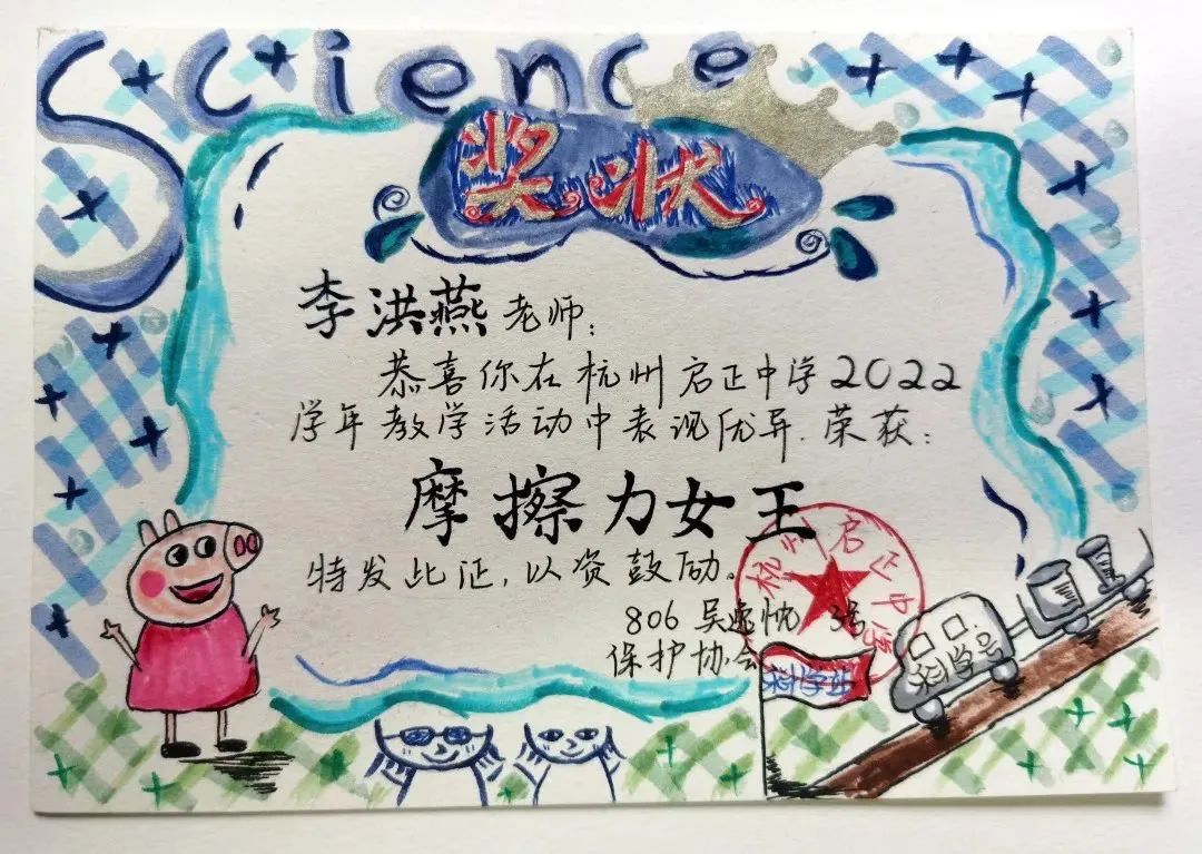 在第39个教师节来临之际,湖州市飞英小学的同学们以别出心裁的方式感谢心爱的老师们。他们亲手制作了奖状和奖杯,并设立了如“最美教师”“才华横溢奖”“最具亲和力奖”“宇宙超级无敌帅气奖”等一系列特殊奖项,用独特的表彰方式展示对老师们的无限敬意和感激之情。孩子们的创意将这个教师节变成了老师们心中最珍贵的时刻,每个奖项都代表了学生们独特的赞赏和爱意。
