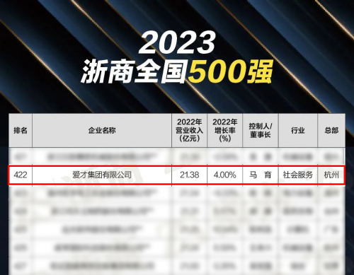 日前,“2023浙商全国500强”榜单正式发布。登榜的500家企业合计创造了12.41万亿元的总营收,爱才集团以21.38亿元营收荣登“2023浙商全国500强”榜单。