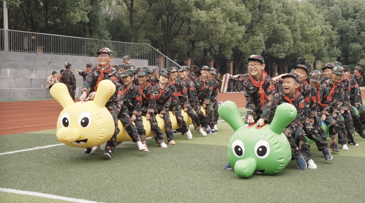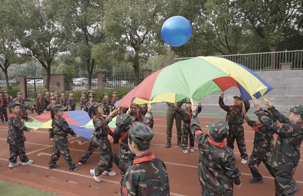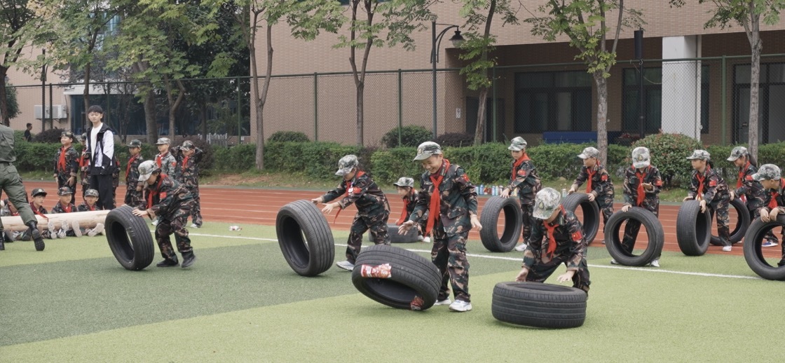 启动仪式结束后,1-3年级的孩子们穿着整齐的迷彩服,在操场整齐排列,在18位教官的带领下展开训练。一年级组进行“合格小小兵”训练,学习站姿、军队纪律等基础内容;二年级组进行“军魂小小兵”训练,体验圆木、轮胎、迷彩网、独木桥、障碍挑战赛等体育竞技项目;三年级组进行“少年百夫长”训练,体验彩虹颠球、毛毛虫竞速、袋鼠跳、合力建塔等团建小游戏。同学们在训练中,喊着整齐的口号、踏着有力的步伐,互相协作,完成挑战。