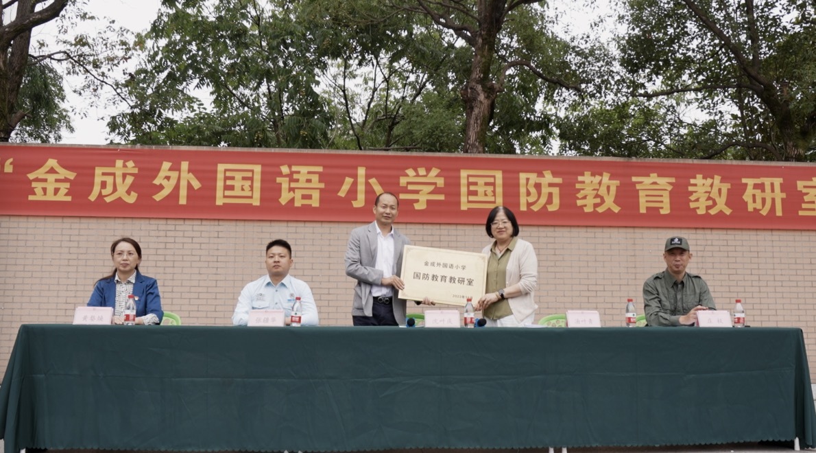 “国防教育是爱国主义教育的重要组成部分,也是国家人才培养的关键环节。国防教育试点项目的启动,标志着金成外国语小学国防教育事业迈上了一个新的台阶,这不仅是推进学校安全工作的重要方式和有效的途径,更有利于提高学生的身心健康和意志品格。”沈叶庆秘书长发表讲话,并为“金成外国语小学国防教育教研室”授牌。