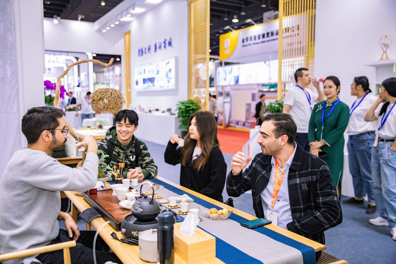 在文创展区,美国肯恩大学交换生 Vitor 和国际生 Mariia 体验了中国书法和传统茶艺。他们生疏地用毛笔在宣纸上写下自己的中文名和一句“你好,义乌”;在老板的指导下,Vitor 泡茶、分茶、品茶,吸引来众多游客,纷纷用相机拍下这一幕。“It's pretty cool!这真的是一次非常棒的体验!”他们感叹于这次奇妙的体验。