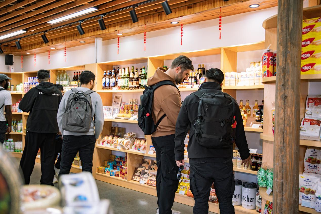 李祖村有一家进口商品馆,店里的商品大多是通过“义新欧”班列运输过来的。国际生和交换生们惊喜地发现了自己家乡的产品,并讨论着家乡产品的特色。梨子是李祖村的特产。在有90多年历史的李氏梨膏糖店里,卖家热情地请他们吃秋梨棒棒糖,品秋梨膏,向他们讲述非遗梨膏糖制作技艺。在路边小摊上,他们发现了“斗米虫”,“斗米虫”颇具药用价值,在古代,古人要用一斗米才能换到一条虫,因此才有了“斗米虫”的称呼。交换生Cristian和Vitor还现场品尝了斗米虫。从未见过斗米虫的他们,打趣道味道挺好的,尝起来像干玉米,并没有想象的那么可怕。