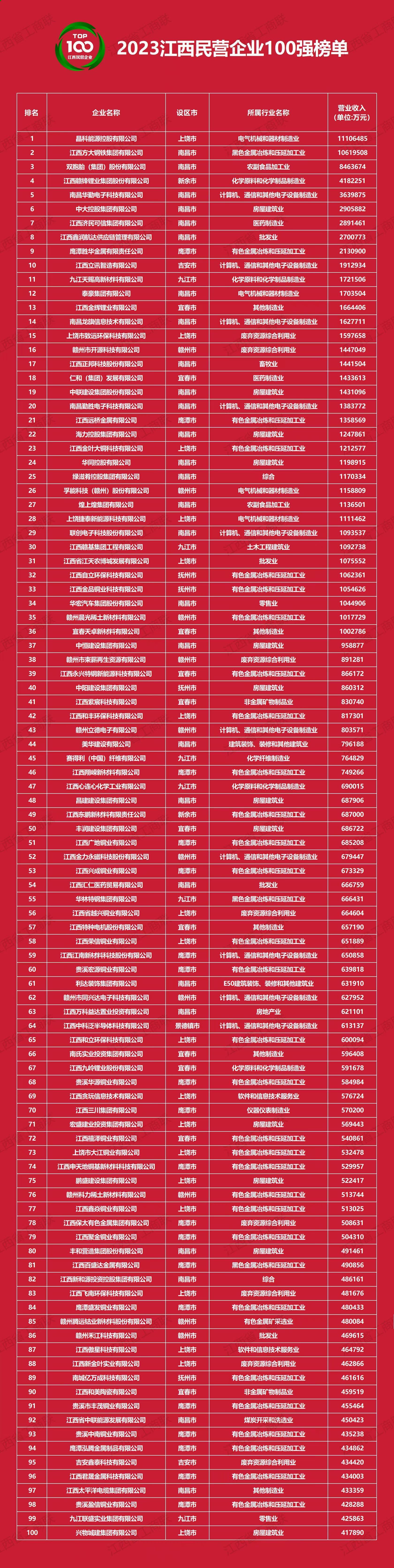 今视频客户端讯 11月3日,2023江西民营企业100强榜单公布。晶科能源控股有限公司以营收1110.65亿元位列第一,江西方大钢铁集团有限公司、双胞胎(集团)股份有限公司分别位居第二、第三。