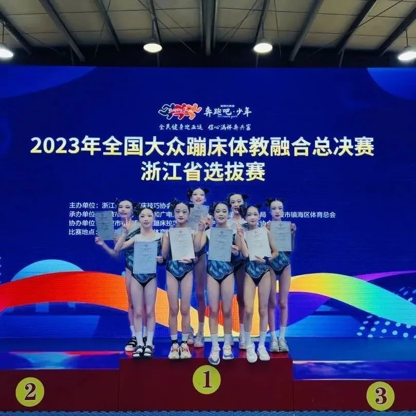 7月24日,2023年全国大众蹦床体教融合总决赛浙江选拔赛在宁波市镇海区湘北体育馆举行。杭州市西湖第一实验学校茗悦兴申蹦床队的八名队员在袁德法副校长的带领下荣获省U12组一等奖。