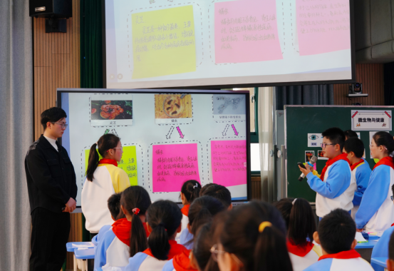 文苑小学的徐佳俊老师带来了《微生物与健康》科学跨学科课堂展示。徐老师采用“任务驱动教学法”,融合道德与法治等学科,设计了探究“微生物的利与弊”的学习活动,辅以实验观察和研讨式教学法,让学生在观察中思辨研讨,达成跨学科融合学习的理解与迁移。