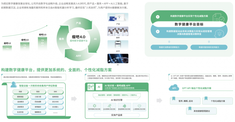 瘦吧科技勇当数字健康领域的先行者,一直致力于推动健康数字化创新和科技应用的发展,以满足不断变化的市场需求。从2020年的大数据与物联网智能技术结合,深入推进“大数据+大健康”融合发展,到2023年的大数据与AI人工智能技术结合,将海量案例和样本交由数据后台进行分析学习,根据用户的身体情况和生活习惯,提供千人千面的健康管理方案,同时借助人工智能端口,更实时地对用户进行反馈,真正做到健康管理方案的个性化、智能化、实时化以及动态化,提升用户体验和效果。目前瘦吧已帮助390多万用户累计减重超过500万公斤,用户遍布六大洲107个国家。