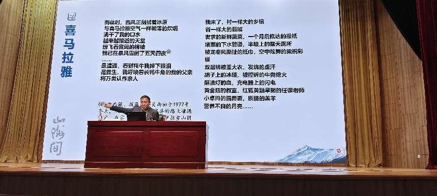 “首先我想给大家介绍一首还未正式发表的长诗。这是我花了2个多月写出来的,全诗长880行,题目叫《喜马拉雅》!”为了消解写诗带来的巨大难度,更为了开启诗性的灵光,他坦言诗与酒的关系:“写诗为啥要喝酒?因为酒是粮的精华,诗是语言精华!”接着,他专门挑出诗中描写“援藏”经历的部分,逐字逐句朗诵起来。在念到初至西藏部分时,他几度落泪,并用颤抖的双手掏纸巾擦干。