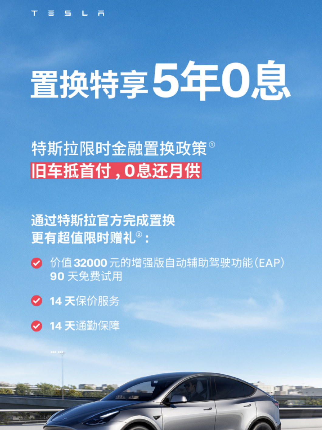 特斯拉微博4月3日消息,特斯拉中国今日宣布,针对Model 3/Y车型上线限时低息置换政策,并首次推出“0利息”分期购车的优惠政策。