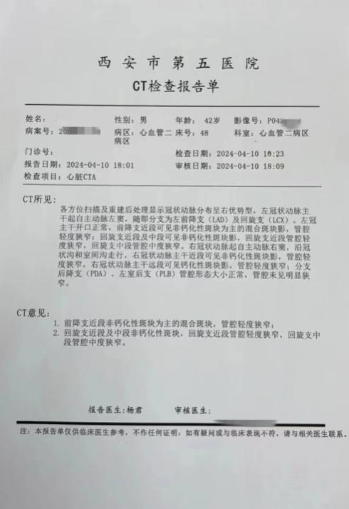 赵先生,42岁,具有吸烟史和早发冠心病家族史,2023年10月在他院进行心脏冠状CT检查,结果显示左冠回旋支中段混合斑块,管腔中—重度狭窄。