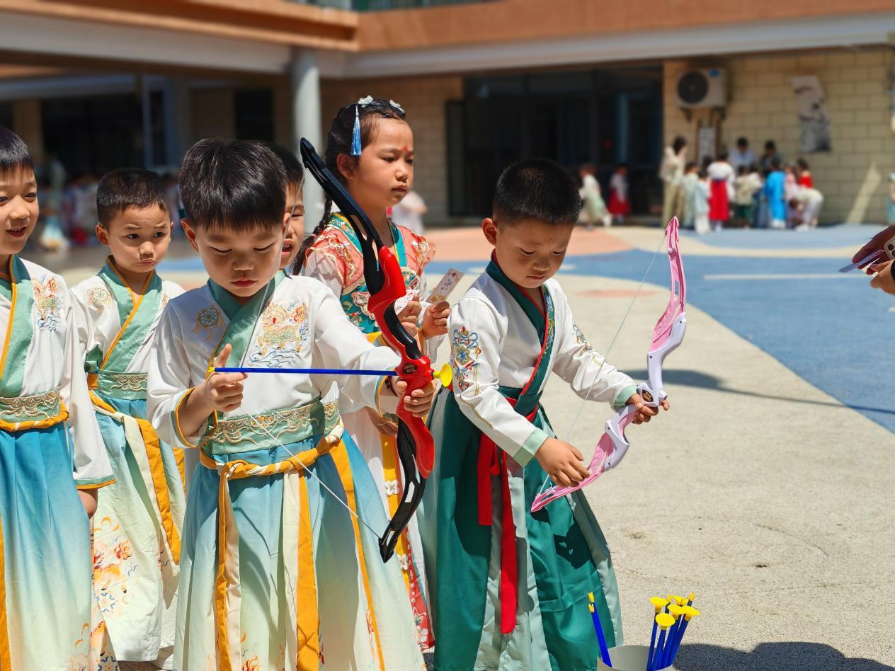 底蕴深厚、源远流长的中华传统文化在孩子们的血脉中流淌,5月28日上午,湖州市吴兴区织里镇织东幼儿园举办了“国风古韵,传承经典”儿童节古典文化活动。小朋友们正衣冠、行古礼,感受朱砂启智、击鼓鸣志等中华传统礼仪,了解了中华传统文化,感受了节日浓厚的古典文化氛围。游园会上设置了各式别具趣味的传统民俗游戏,游戏摊位有盲人敲锣、套圈、投壶射箭、斗草、品茶……等各类活动,孩子们在开心快乐和文化熏陶中迎接“六一”儿童节。