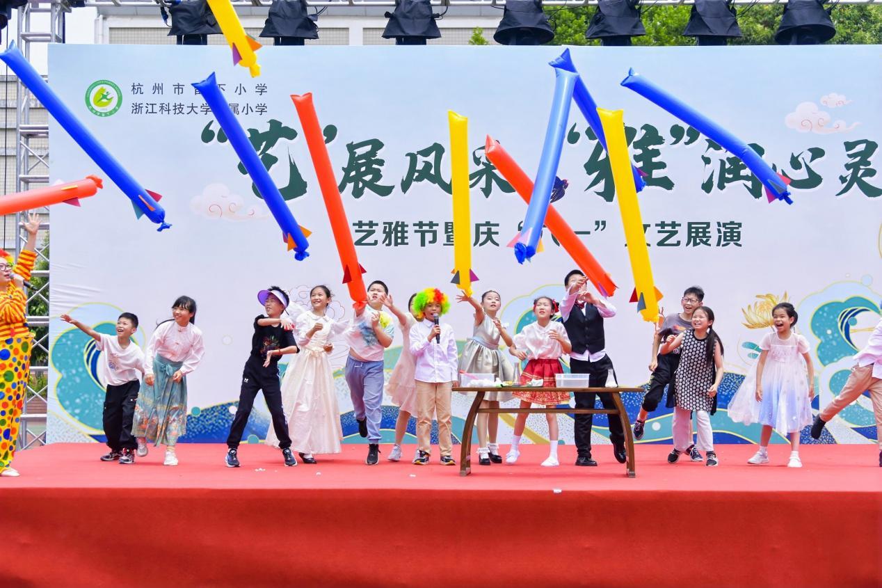 在这个属于孩子们的节日里,杭州市留下小学开展“‘艺’展风采,‘雅’润心灵”艺术节庆六一活动。早上,孩子们穿着特色服装走上红毯,摆出最酷的姿势,进行“笋娃”最炫时装秀。而后全校师生共同参加了一场融合音乐、体育、美术、科学等学科的艺术汇演,管乐团、合唱团、科学魔术秀、健美操表演,一场视觉盛宴唤醒孩子们的眼睛。