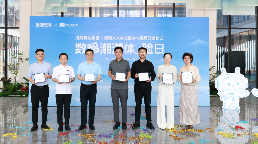 3、2、1!随着绸带落地,海亮科技集团与湘湖未来学校联合打造的数字化展厅——“数智湘湖”正式开馆。