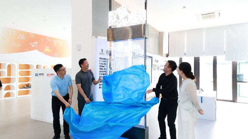 剪彩仪式结束后,在全体与会嘉宾的见证下,朱周刚、梅亚民、张岩、陈颖共同为“数智湘湖”展厅揭牌,象征着展厅正式开门“营业”,也标志着海亮科技与湘湖未来学校在科技与教育的深度融合之路上迈出了重要一步。