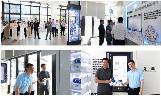 仪式后,与会嘉宾跟随专业讲解员,开启了一场“数智湘湖”体验之旅。朱周刚、梅亚民等亲身体验了深受师生喜爱的热门产品“积分柜”,现场兑换了萌趣的海亮科技IP公仔,并就多款产品聚焦的教育教学痛点、实际应用场景等展开进一步探讨。