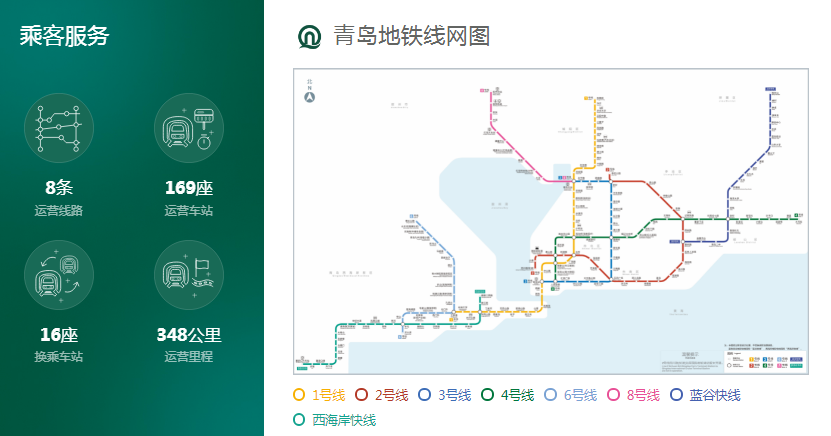 目前,青岛地铁集团开通运营线路8条、348公里,串联青岛七区一市,占青岛公共交通客运量比重增至44%。
