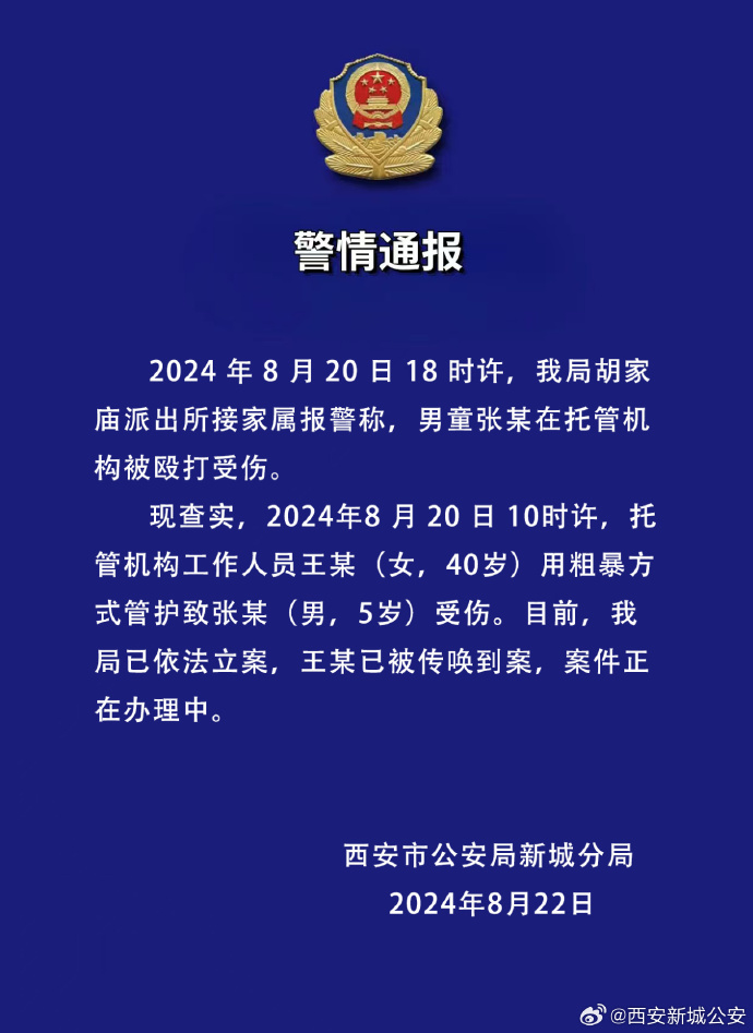 现查实,2024年8月20日10时许,托管机构工作人员王某(女,40岁)用粗暴方式管护致张某(男,5岁)受伤。目前,我局已依法立案,王某已被传唤到案,案件正在办理中。
