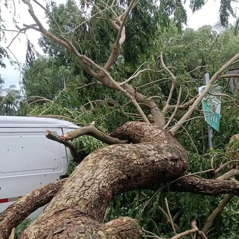 记者9月7日下午来到海口市海垦路农垦东大院附近的这棵大黄花梨倒伏现场,只见这棵黄花梨枝繁叶茂、树干粗壮,横卧地面,根部也已断裂脱离地面,它的枝干还砸中了停在一旁的一辆白色面包车。