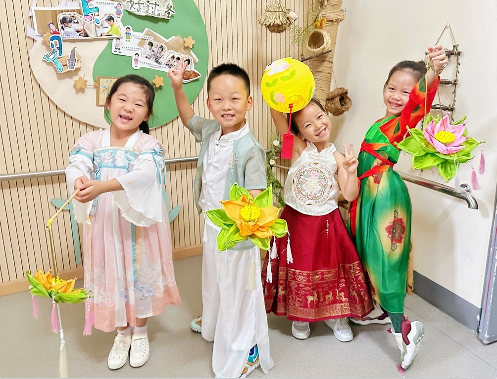 着传统服饰,沉浸式感受并参与品茶、拓印、非遗漆扇、制作灯笼、冰皮月饼等活动,在体验中加深对中华文化的认识,杭州市钱塘区新东港幼儿园的大朋友小朋友今日幸福感爆棚。
