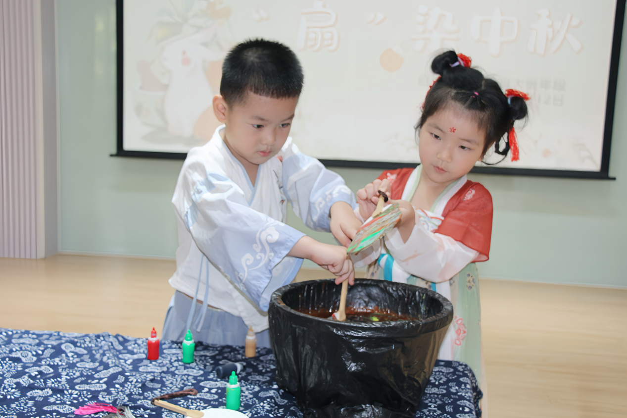 在这个充满团圆氛围的中秋节,湖州市白雀中心幼儿园的孩子们开展了一场别开生面的漆扇制作活动。孩子们在老师的指导下将彩漆滴入水中,看彩漆随着水流变化出不同图案,然后将团扇小心翼翼地放入水中,水漆的色彩附着在扇面上,穿插交错、流云变换,让一把把普通的扇子变成了独一无二的艺术品。在一把把普通的扇子变成了独一无二的艺术品的过程里,孩子们近距离感受非遗魅力,领略传统工艺之美,为中秋佳节增添了一抹绚丽的色彩。