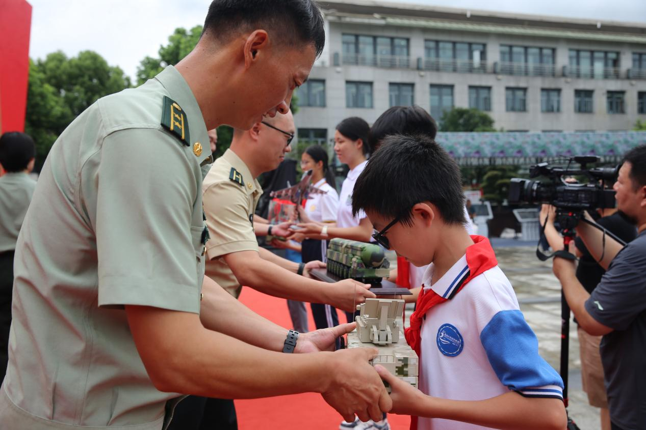 在解说员的引导下,全体师生有序参观浙江国防教育成果展台。参与展陈的展品是各学校和驻浙部队遴选推荐,其中有青少年学生制作的手工模型、科技发明、学校国防教育读物、数字化模拟体验设备以及军兵种武器装备模型等。