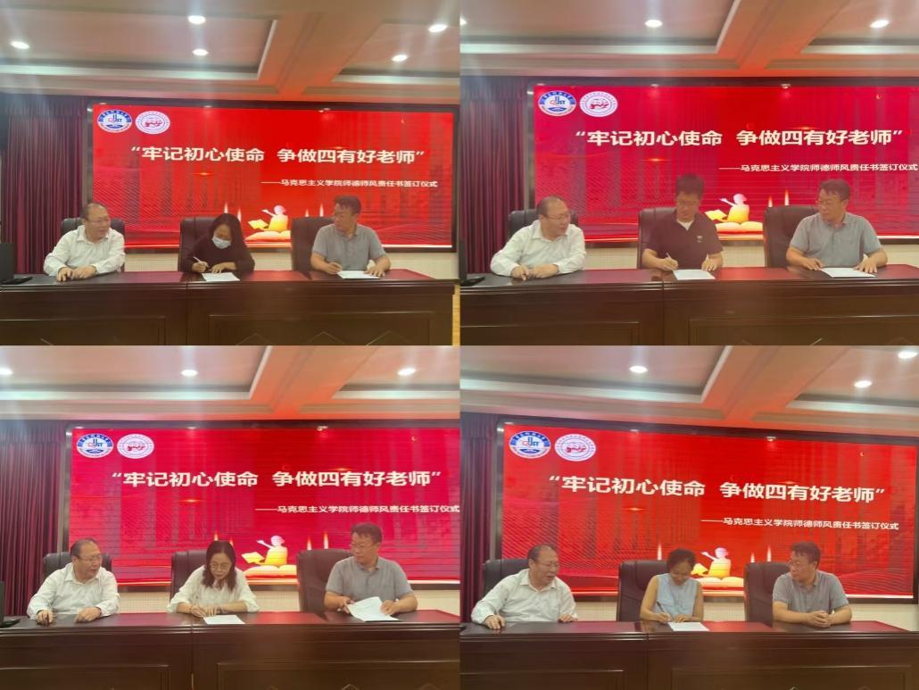 学院党政负责人与各教研室主任“牢记初心使命 争做四有好老师”师德师风建设责任书。各党支部书记、教研室主任与本教研室教师签订师德师风建设责任书。