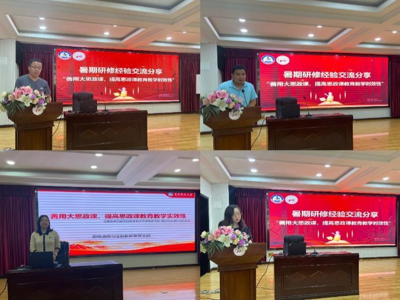为真正做到“善用大思政课,提高思政课教育教学时效性”,各教研室开展暑期研修经验交流。郭士民老师代表马克思主义基本原理教研室党支部以“在‘行走的思政课’中找寻文化之根、增强文化自信”为题,分享了党支部参观西安当地红色纪念馆,并与延安大学马克思主义学院同仁进行交流研讨的研修心得。邵长威老师代表马克思主义中国化教研室党支部以“跟随总书记足迹,以‘践’促学提升思政育人质量”为题,分享了党支部学习塞罕坝精神,并与燕山大学马克思主义学院进行交流探讨的研修心得。杨晓越老师代表中国近现代基本问题研究教研室党支部以“行走中感悟文化魅力,赋能思政教学”为题,分享了党支部参观遵义会议纪念馆及民族博物馆等文化遗址,并与贵州师范大学马克思主义学院教师进行座谈的研修心得。马丽娟老师代表思想政治教育教研室党支部以“传承中国革命文化,赓续红色基因”为主题,分享了党支部赴四川进行实地考察并与成都理工大学马克思主义学院交流探讨的研修心得。
