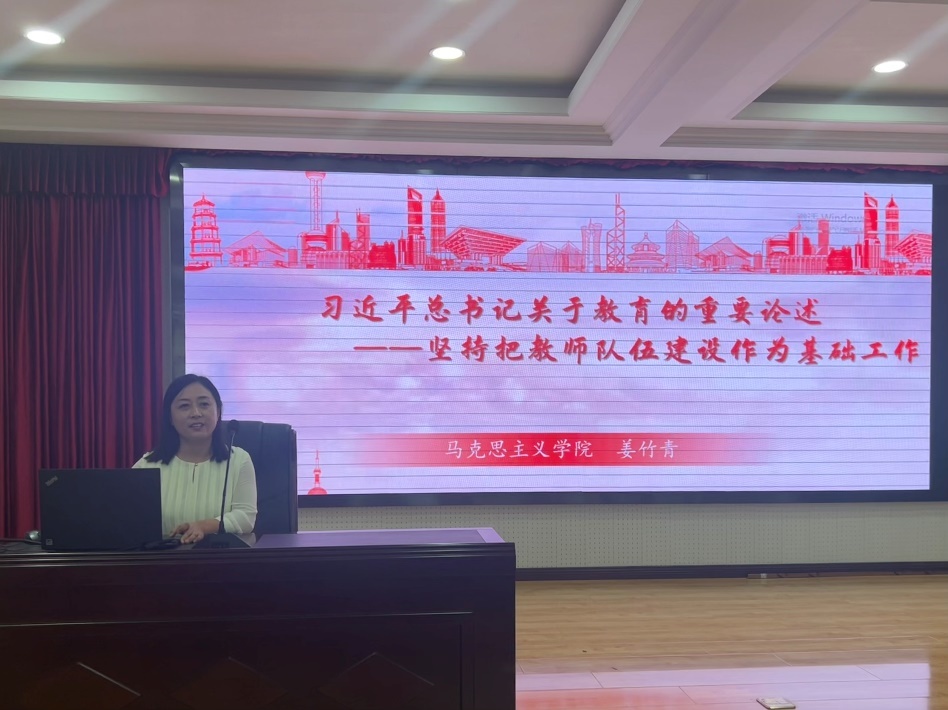 学院工会主席姜竹青博士从内容概要、核心要义、实践成就、重大意义等方面作“习近平总书记关于教育的重要论述”的辅导报告。她指出,习近平总书记关于教育的重要论述是中国特色社会主义教育理论发展的最新成果,是建设高质量教育体系、建成教育强国的指导思想和根本遵循,广大教师要要以树人为核心、以立德为根本,进一步健全立德树人落实机制,努力培养德智体美劳全面发展的社会主义建设者和接班人。