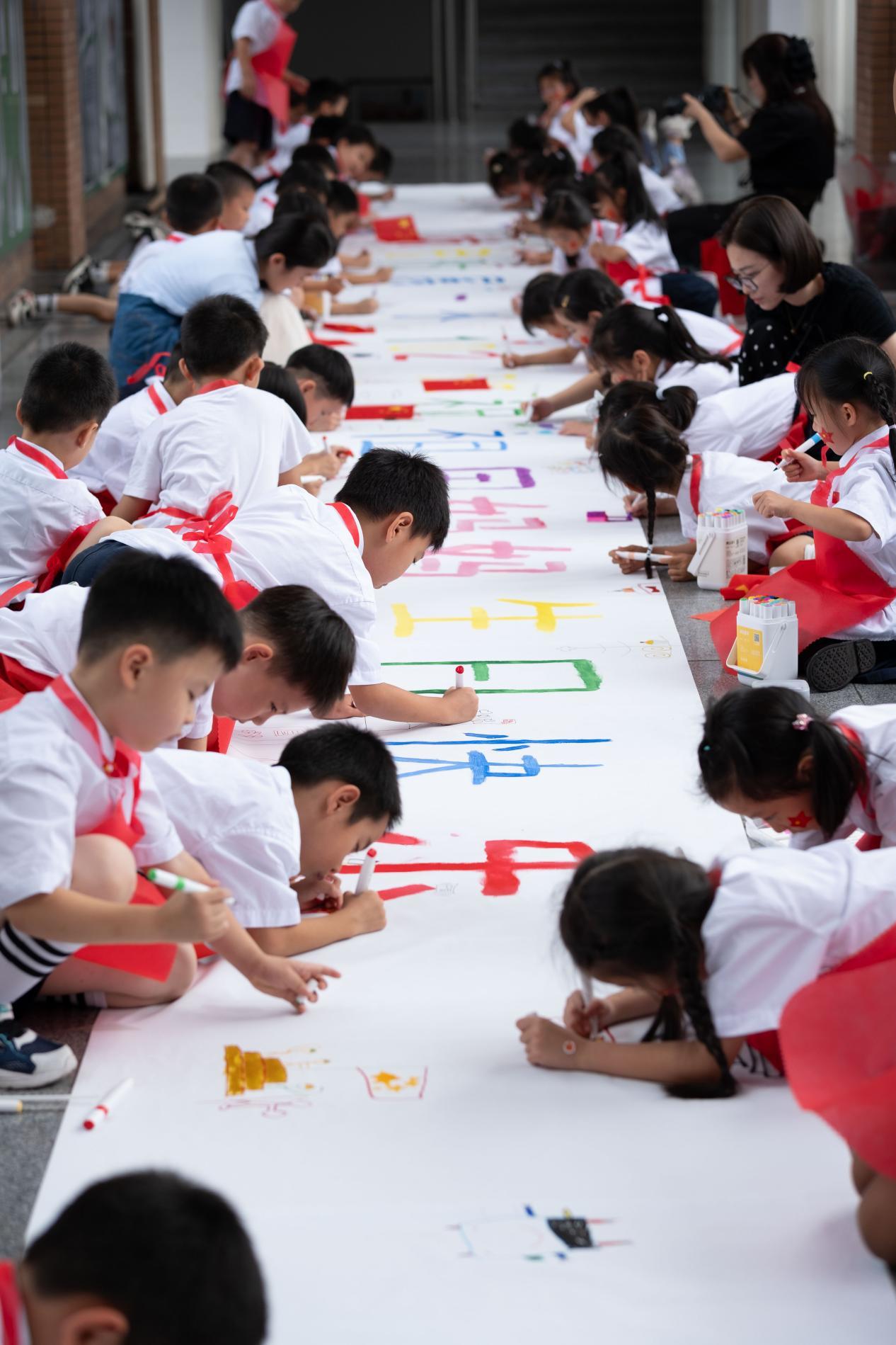 湖州市织里镇晟舍小学举行了一场以“我爱我的祖国”为主题的庆祝活动。孩子们齐聚一堂,共同绘制“祝福祖国”长卷,以表达对祖国母亲的爱。活动现场,孩子们拿起画笔,发挥着天马行空的想象力,将五彩斑斓的色彩涂抹在长卷上。画卷中,既有繁荣昌盛的城市景象,还有可爱的动物和美丽的自然风光。