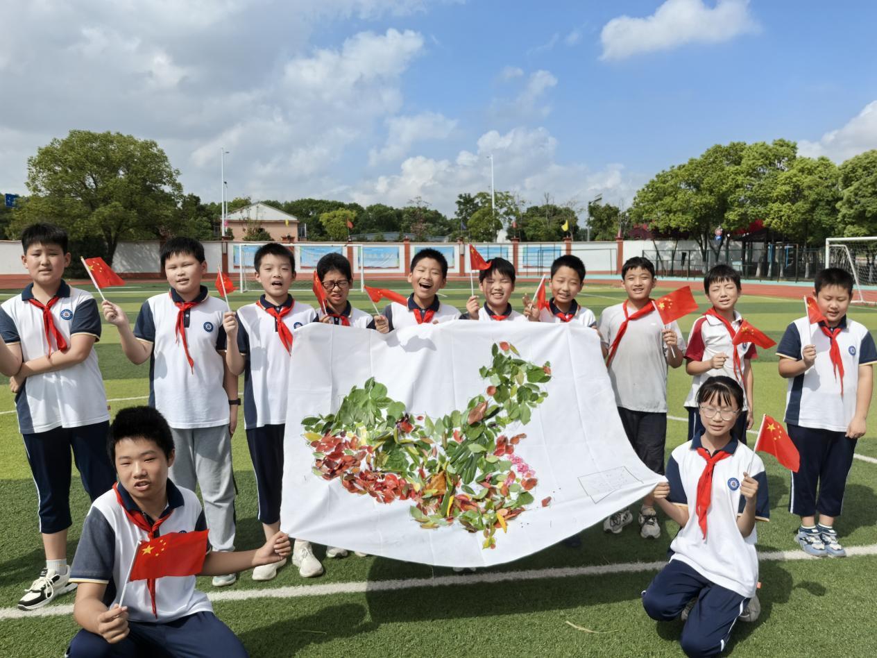 湖州市吴兴区第一小学的少先队员们和退役军人同升一面旗,加深了同学们的爱国情感和民族自豪感,也向退伍军人致以了崇高的敬意。此外,学校策划了迎国庆争章活动,低年级小朋友用秋天丰收的果实创作出一幅幅爱国画卷,高年级的小朋友则制作小报、用废弃物制作灯笼、给军人叔叔写信,让孩子们在参与中感受到了节日的氛围和乐趣,更在潜移默化中增强了他们的国家意识和爱国情怀。