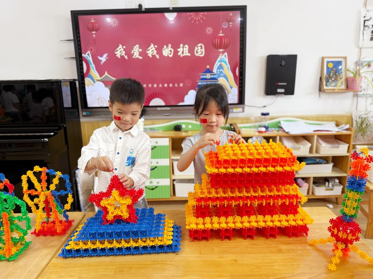 湖州市南太湖幼儿园特别策划了一系列爱国教育活动。其中,大班幼儿参与了“小手‘筑’国庆 祖国‘住’心中”雪花片主题搭建活动,通过亲手制作天安门、火箭等模型,表达对祖国的热爱与祝福,共同庆祝祖国妈妈75岁生日。此外,小中班的孩子也积极投入其中,他们通过绘制国旗、制作中国地图树叶贴画等创意方式,进一步激发了对国家的认同感和爱国情怀。这些活动不仅丰富了孩子们的节日体验,更在他们心中种下了爱国主义的种子。