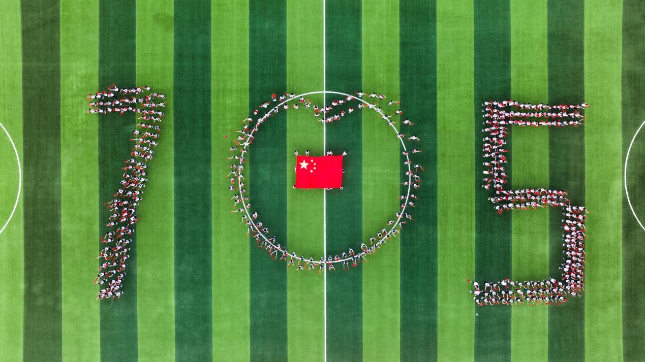 湖州市织里实验小学教育集团全场师生齐唱《歌唱祖国》,歌声嘹亮,情感真挚。而五年级的学生则以创意舞动小红旗,在操场上拼出“75”字样,用行动诠释了对祖国母亲最深情的告白与热爱。