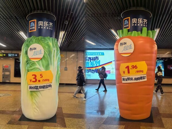 不止于不断优化经营模式与提供质价比产品,奥乐齐也注重和本地消费者的情感联结。在营销灵感上,奥乐齐的一系列举措,也充分突显出其对本土市场的深刻洞察。年初,奥乐齐曾开启 "地铁‘长出'胡萝卜白菜"这一创意十足且贴近生活的营销活动,该活动荣获第十五届(2023-2024)虎啸奖户外营销类金奖及餐饮与服务类铜奖、第九届金场景营销大奖地铁类金奖。此后,ALDI奥乐齐又携手懂经课代表王琳,打造"姨姨表情包"登上户外大屏事件,成功地加深了消费者对奥乐齐产品特色及品牌形象的理解与认知,拉进和本地消费者距离的同时亦提升了品牌的好感度。度过中国市场开拓期的奥乐齐,正在通过更具新鲜感的营销创意,塑造其立体的品牌形象。