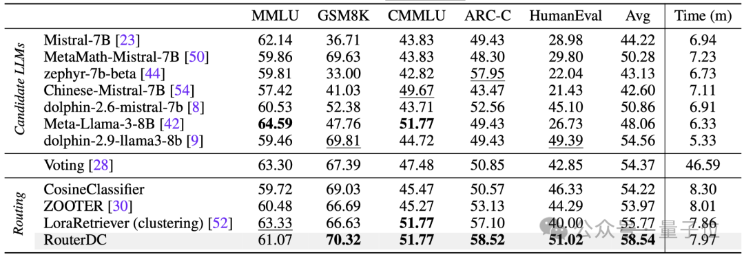 RouterDC显著好于最优的单个模型,平均具有3.98%性能提升。在单个任务的层面,RouterDC在三个任务上相比表现最优的单个模型取得了准确率的提升,其中GSM8K提升了0.51%,ARC-C提升了0.57%,HumanEval提升了1.63%。