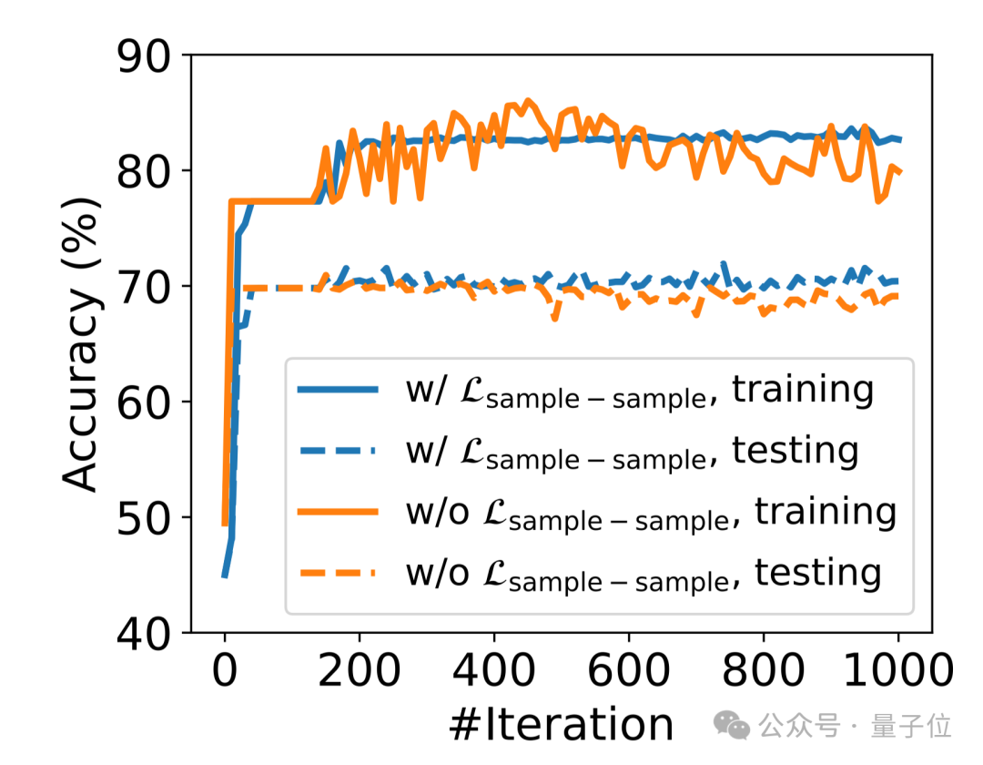 为了探究样本-样本损失的作用,图3展示了在是否有样本-样本损失的条件下训练和测试准确率曲线。可以看出,RouterDC(w/o Lsample-sample)有明显的震荡现象,而RouterDC则稳定得多。