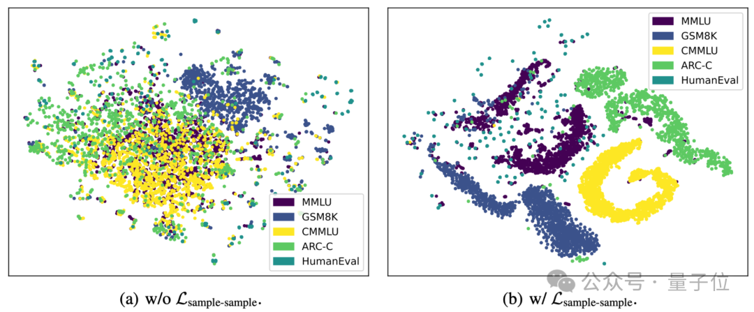 图3(a)可视化了使用RouterDC(w/o Lsample-sample)提取的训练样本的TSNE特征,可以看到,属于不同任务的训练样本粗略地混合在一起。而在结合Lsample-sample之后,训练样本有了清晰的聚类结构(如图3(b)所示)。
