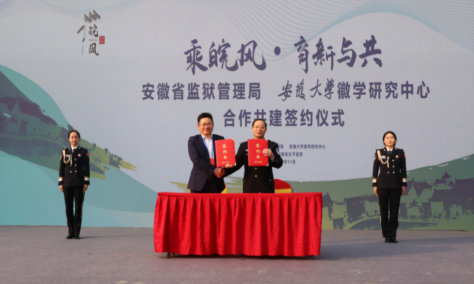 11月14日下午,安徽省监狱管理局和安徽大学徽学研究中心在女子监狱举行合作共建揭牌仪式。省监狱管理局局长胡来龙和安徽大学副校长汪海燕分别致辞并共同签署了《安徽省监狱管理局 安徽大学徽学研究中心合作框架协议》,省监狱管理局政委梁国强和安徽大学徽学与中国传统文化研究院党委书记方平共同为徽文化研学基地揭牌,省监狱管理局副局长孙增明和省女子监狱党委书记、监狱长刘颖共同为“皖风”品牌揭牌。