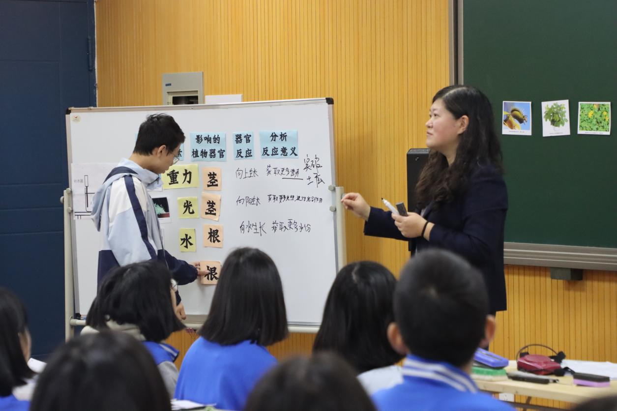 杭州市风帆中学费骏靖老师带来《植物生命活动的调节》,以“种子萌发”的情景问题导入,通过与学生的互动引出概念性知识,并且灵活运用,促成学生理解新概念。在过程中做到了“温故知新”,通过“搭框架”和提问的形式,以小构大,由细到粗地实施“验证植物的茎具有向光性”的方案设计。在概念辨析的过程中,使学生能够自主从生物角度理解感性运动的意义,形成学生学习生物的科学观念。