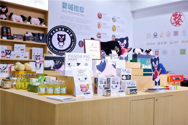 婺城拾珍展区,金华熊猫猪猪主理人沈利介绍道:“熊猫猪猪作为金华婺城区代表参展,因为两头乌国际牧场就坐落在婺城区,此次熊猫猪猪带来了鲜肉制品和深加工产品,还有以两头乌为原型设计的文创类IP产品”,关于品牌原材料的选择上,她介绍道:“金华两头乌的肉质是顶级的,在金华有1700多年的饲养历史,基因非常好!有非常丰富的蛋白质含量、肌苷酸含量,很适合孕妇、老人、小孩食用,是非常好的食材原料!”