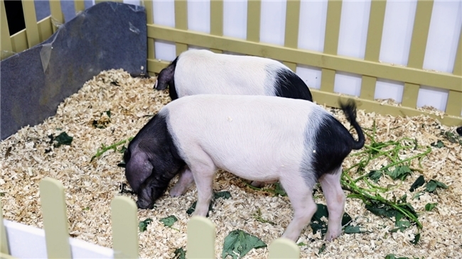 “哎,快看金华两头乌!”“这两只两头乌小猪可以长大吗?”金华馆门口,两只金华两头乌小猪正在吃蕃薯藤,观众纷纷拿起手机围观拍照,询问关于两头乌小猪的情况。