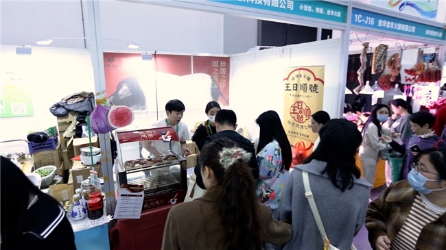 金华市农业农村局张旭升介绍道:“金华馆展出了九个县市区的60余款优秀特色农产品,比较特色的有两头乌系列产品,两头乌香肠、粽子、金华火腿等,还有两头乌火腿冰淇淋、饼干等新研发的产品,佛手茶饮、咖啡、冰淇淋等创新特色产品。”