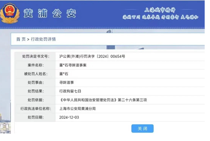 据媒体报道,上海市公安局黄浦分局公示的行政处罚决定书显示,12月3日,董某石因寻衅滋事被警方处以行政拘留7日的处罚。