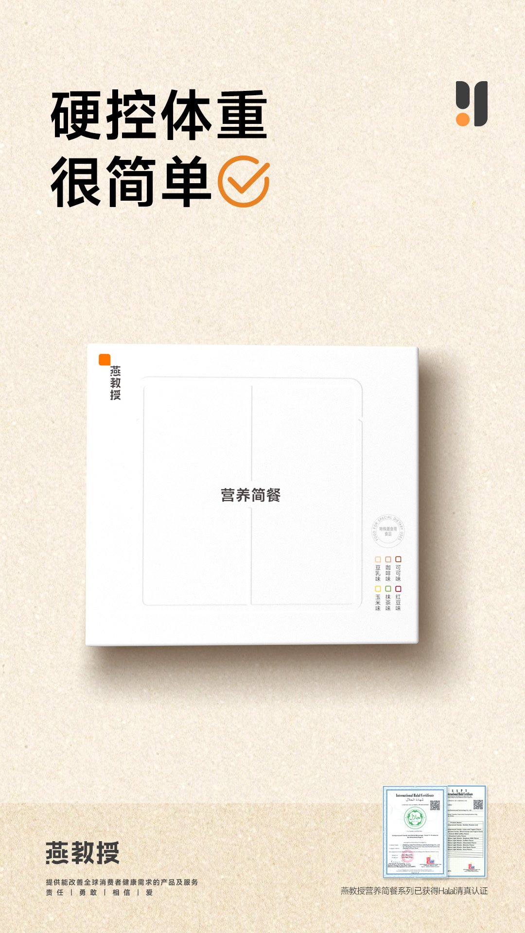 一顿普通正餐的热量大约在 700kcal 左右,而燕教授一袋营养简餐热量仅约 125kcal。通过合理用简餐替换正餐,有助于打造出理想的热量缺口,为健康生活助力。