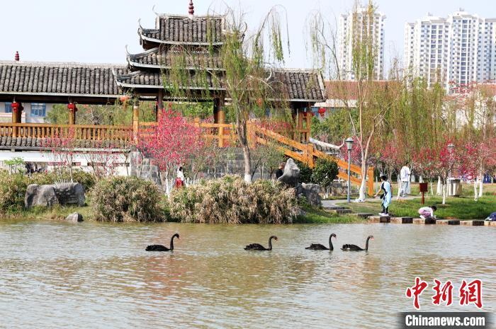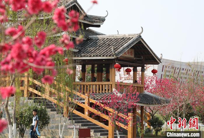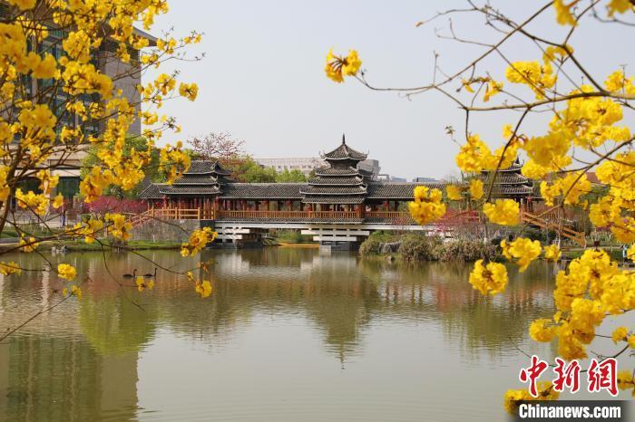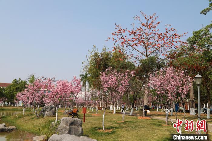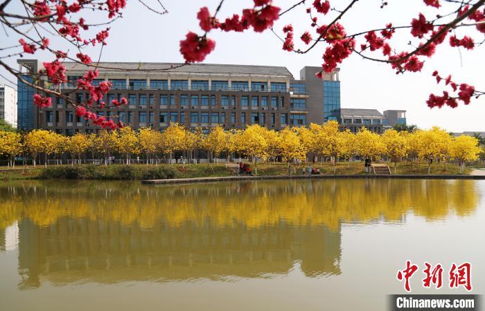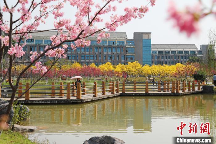 3月23日,广西南宁学院校园内,春意盎然,樱花、桃花、黄花风铃木竞相盛开,为校园增添了浓浓的春意,风景美如画。图为南宁学院校园春景。卢虹灵 摄