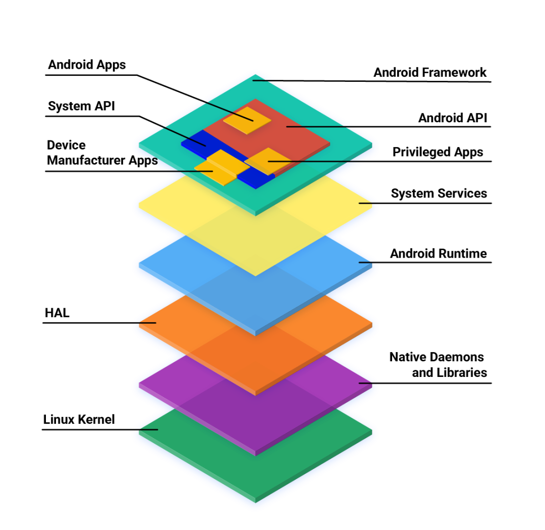 具体来说,Linux 内核基于 GPL 许可证,虽然 kernel module 需要依据 GPL 强制开源,然而 userspace 应用并不受 GPL 传染性的影响,因此无需开源。部分 userspace 应用程序也与传统的 Linux 发行版不同,例如使用 bionic libc 替代 glibc,使用 toybox 替代 busybox 等。此外,Google 还使用了「硬件抽象层」(HAL),允许厂商将不想公开的商业机密资料,比如一些特定的专有功能对应的背后代码和逻辑,存放在这一层上面,即提供了一套 stable ABI(应用二进制界面),使得厂商可以独立于 Android 框架层更新他们的专有代码。