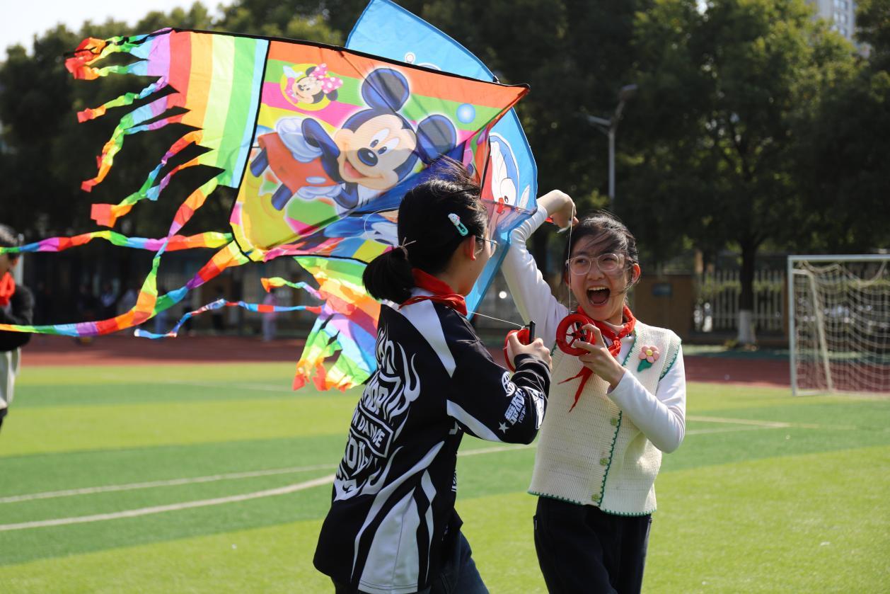 杭州市临平区临平第三小学的操场上,孩子们手拿印有米老鼠、哆啦A梦等卡通形象的色彩缤纷的风筝,在绿茵茵的草地上尽情奔跑,清脆的欢笑声在空气中回荡。另一边,套圈游戏、“老鹰捉小鸡”游戏也正如火如荼地进行着。还有一些孩子高举着写有“嘻 春日游”的手牌,手中捧着自己绘制的春日画作,自信地展示着对春天的喜爱与赞美。