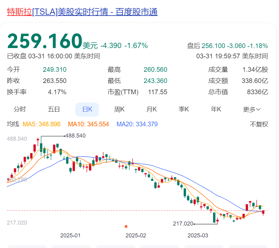 去年11月特朗普宣布胜选后,特斯拉股价曾一路高歌猛进,从251美元暴涨至最高超过488美元。然而1月20日特朗普正式上任后,特斯拉股价却一泻千里,已跌超40%,较去年高点更是接近腰斩,已基本跌回特朗普胜选前。其总市值蒸发超过7000亿美元,马斯克身家缩水超1000亿美元(约合人民币7200亿元)。