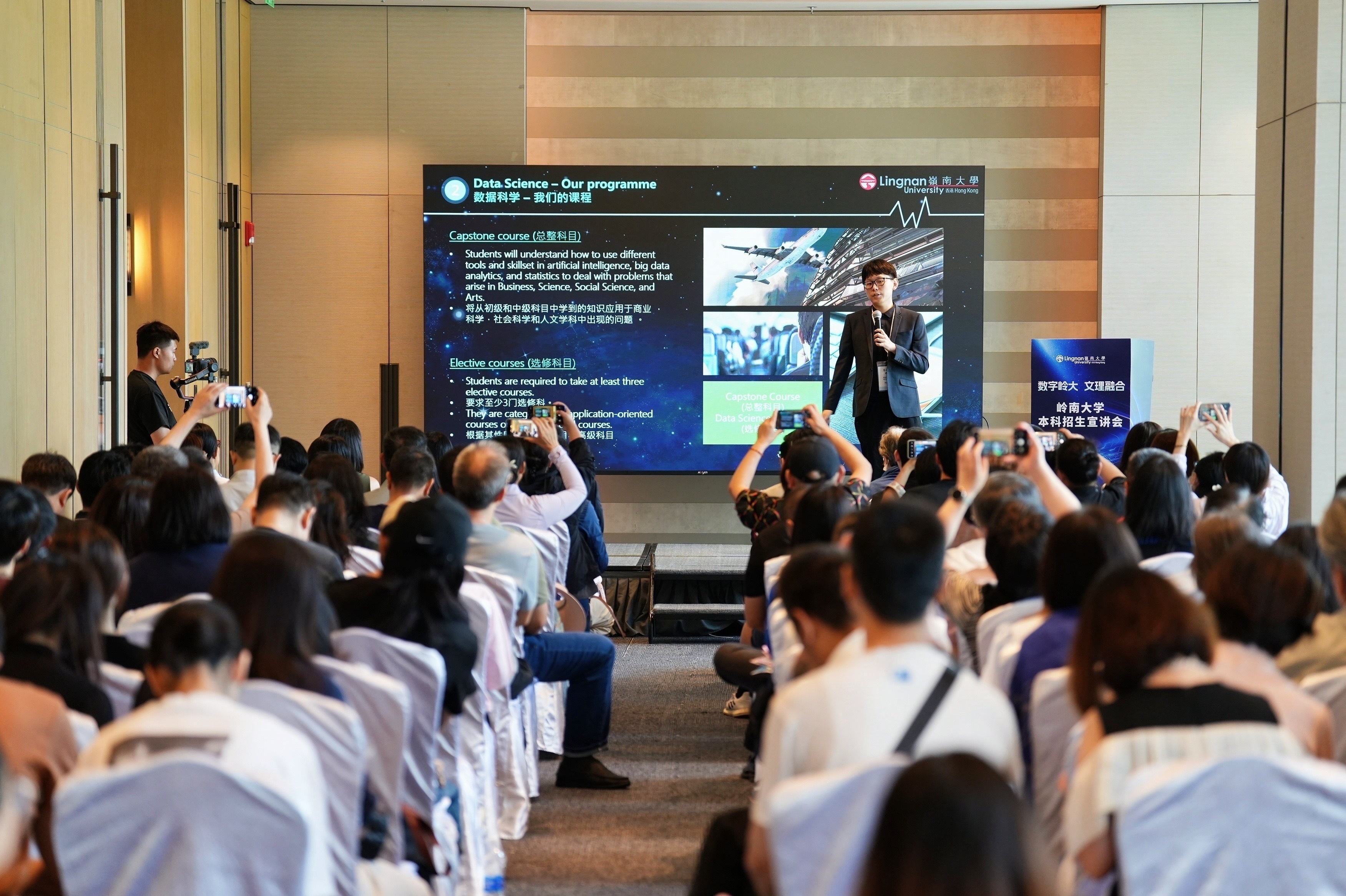 岭大管理层组成的招生团队随后详细解读了岭大2025年度招生政策、专业设置及报考流程,并著重介绍了学校世界一流的师资,数字化课程特色,就业与升学前景等内容。岭大采用小班教学模式,具有宽广的课程设计,本科课程涵盖人文、商业、社会科学、数据科学和跨学科专业,课程内容广泛,包含通识教育和跨学科课程。岭大大力推进跨学科教育,打破学科壁垒,让学生在掌握扎实专业知识的同时,能够拥有广阔的视野和跨领域的思维能力。岭大的文学院、商学院、社会科学学院、数据科学学院和跨学科学院等各个学院都在积极探索人工智能与学科教育的融合实践,力求为学生打造一个多元化的学习环境。